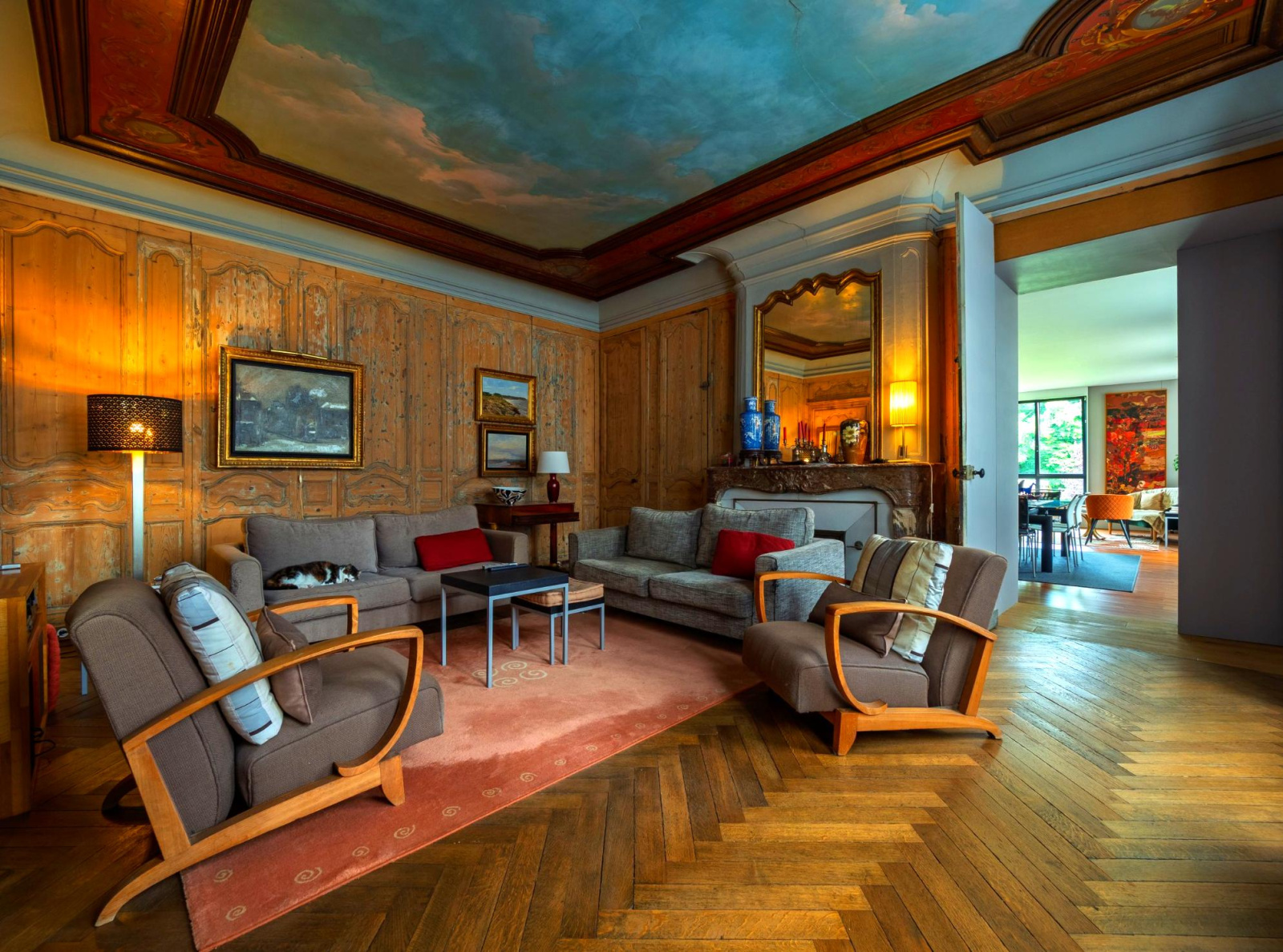 Le premier étage se divise en deux appartements indépendants. La partie la plus ancienne, desservie par l’escalier principal, comprend un vaste salon avec cheminée, poutres apparentes et parquet en point de Hongrie, un second salon avec boiseries, plafond peint à l'imitation d'un ciel et parquet en point de Hongrie, une salle à manger, une cuisine indépendante, une grande chambre et son antichambre avec salle d'eau attenante et toilettes.