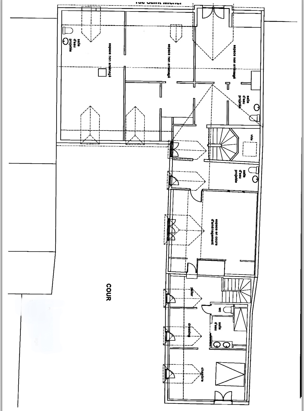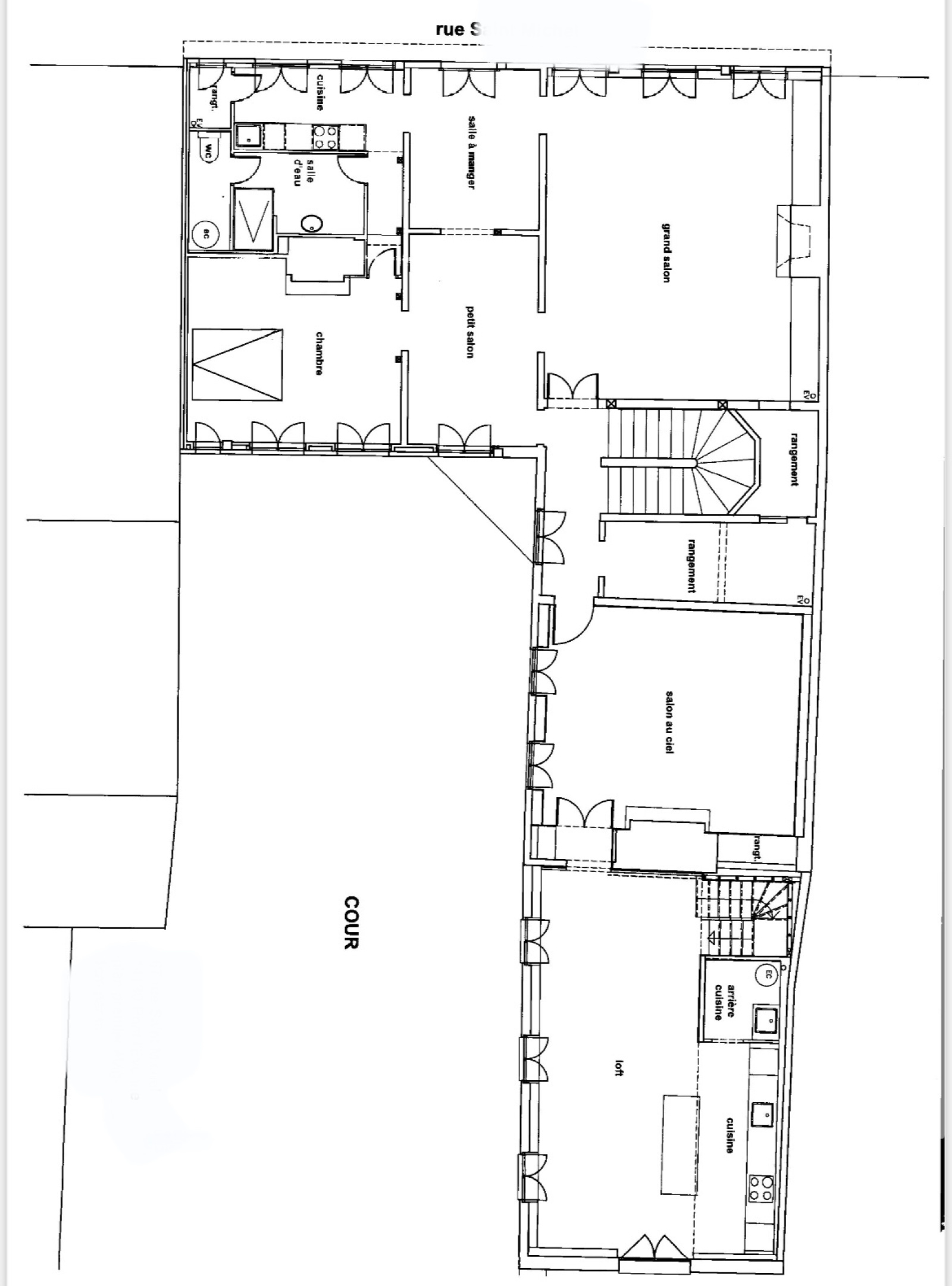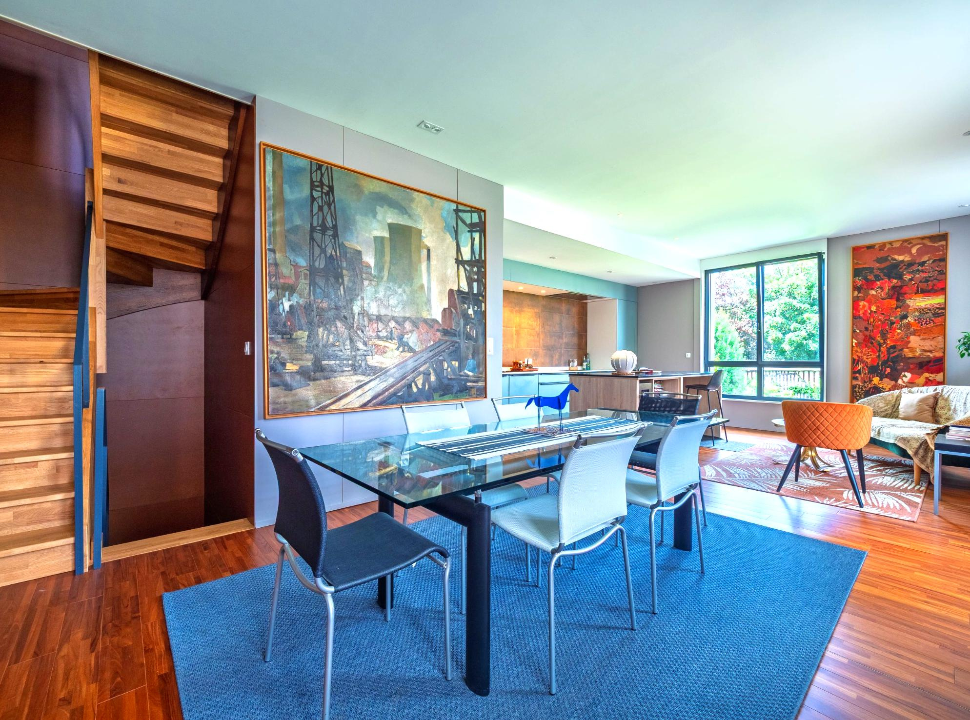 Un deuxième escalier donne accès à un appartement de type loft en duplex, donnant essentiellement sur le jardin, comprenant une grande pièce de réception avec cuisine et arrière-cuisine, et à l'étage une suite avec chambre, salle d'eau, toilettes et dressing.
