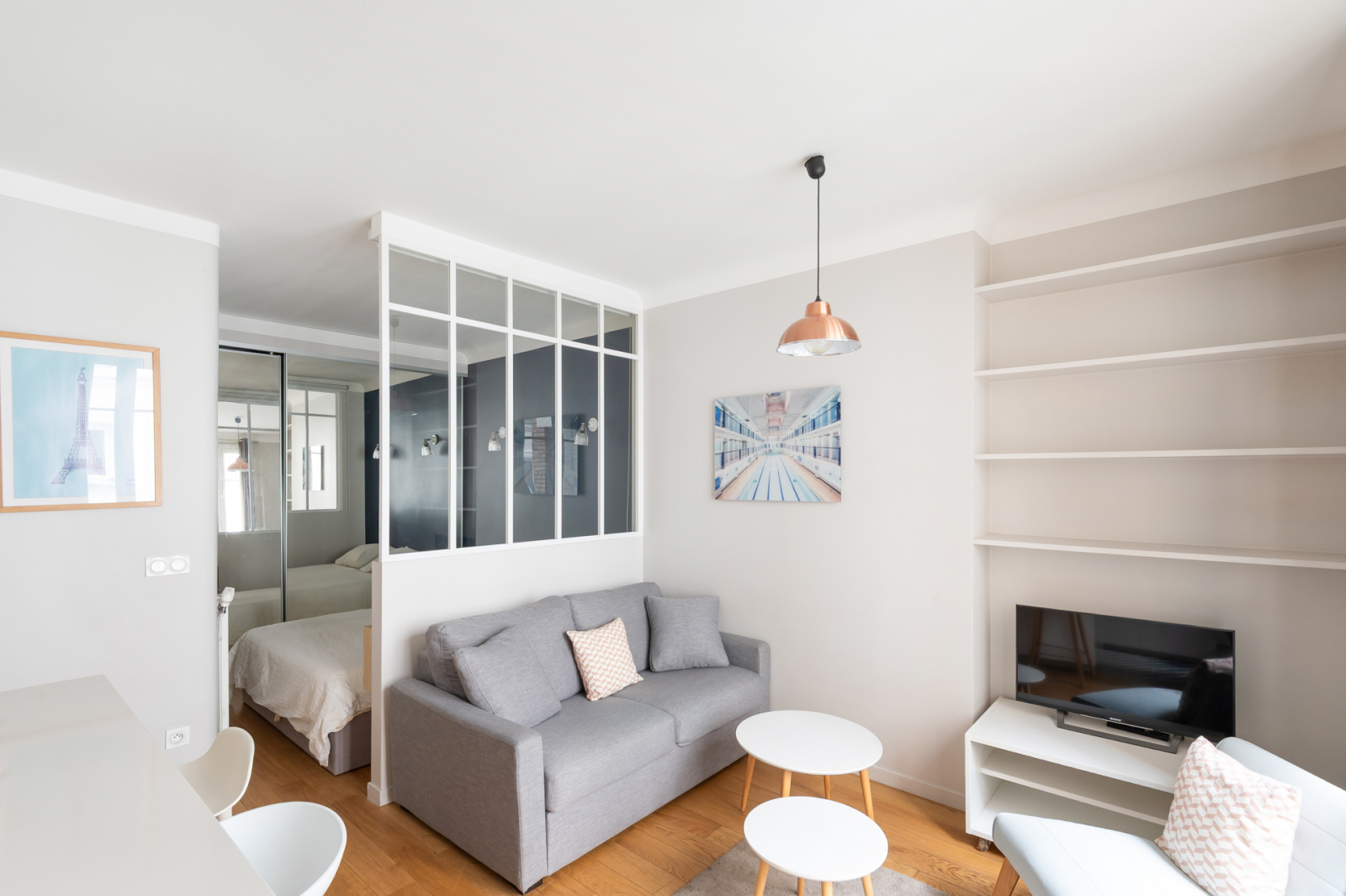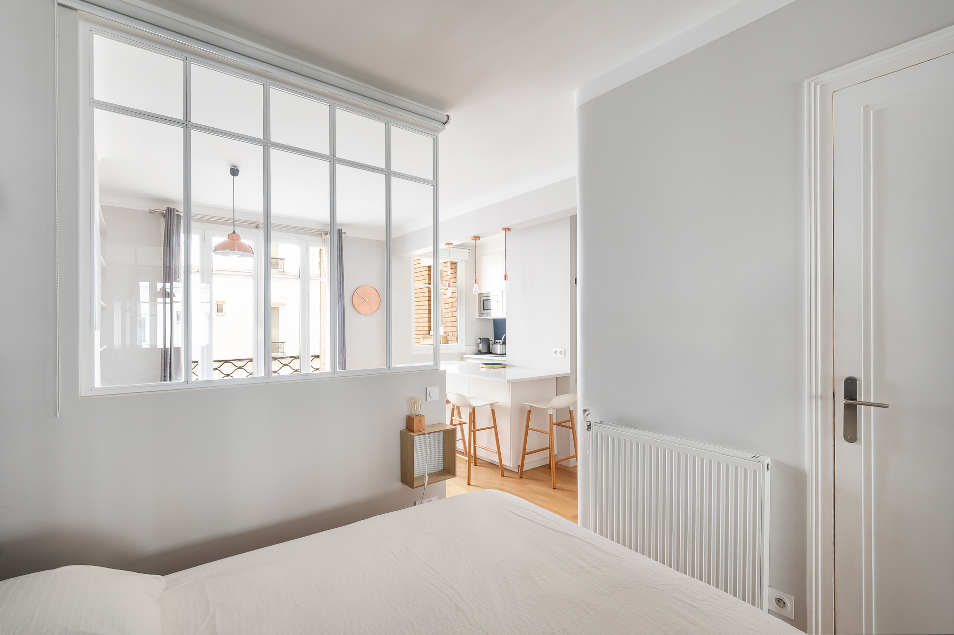 Ce bien entièrement rénové se compose d’un salon avec cuisine ouverte meublée et équipée, d’un espace chambre séparé du salon par une verrière, d’une salle d‘eau et de toilettes indépendantes.