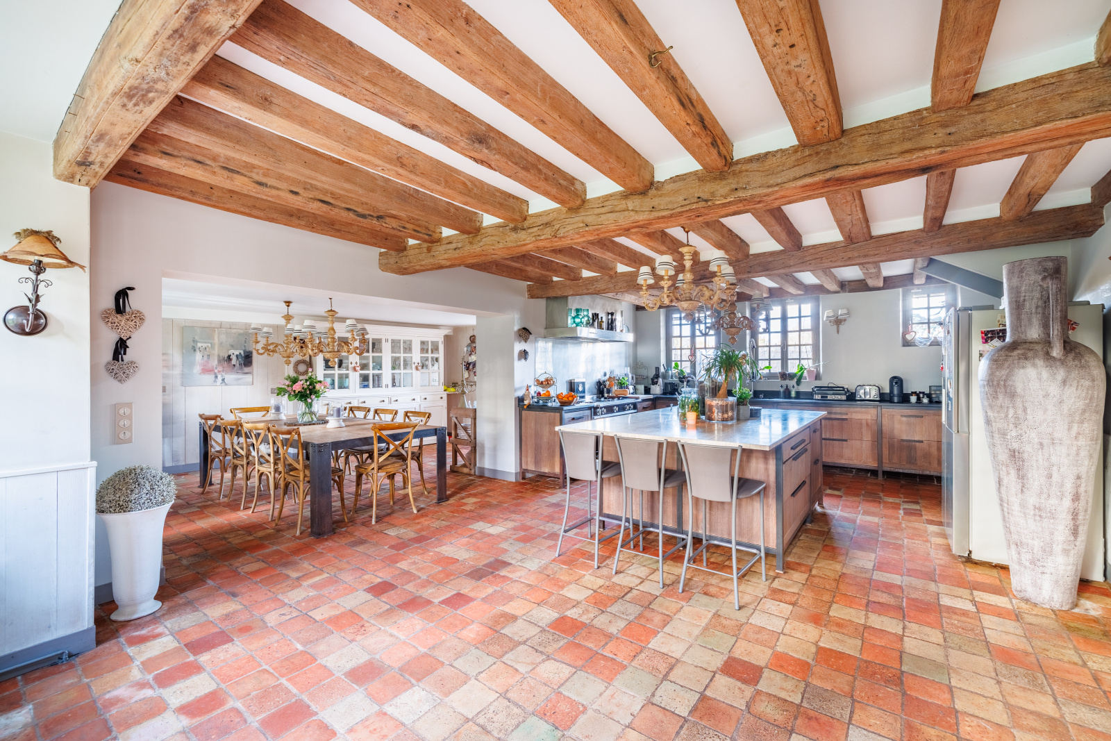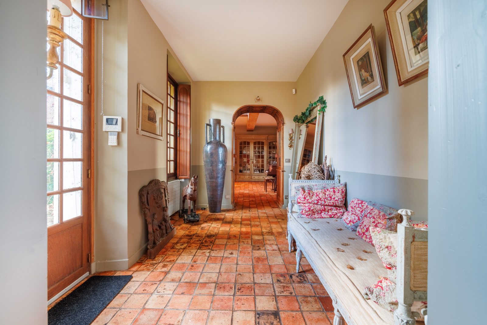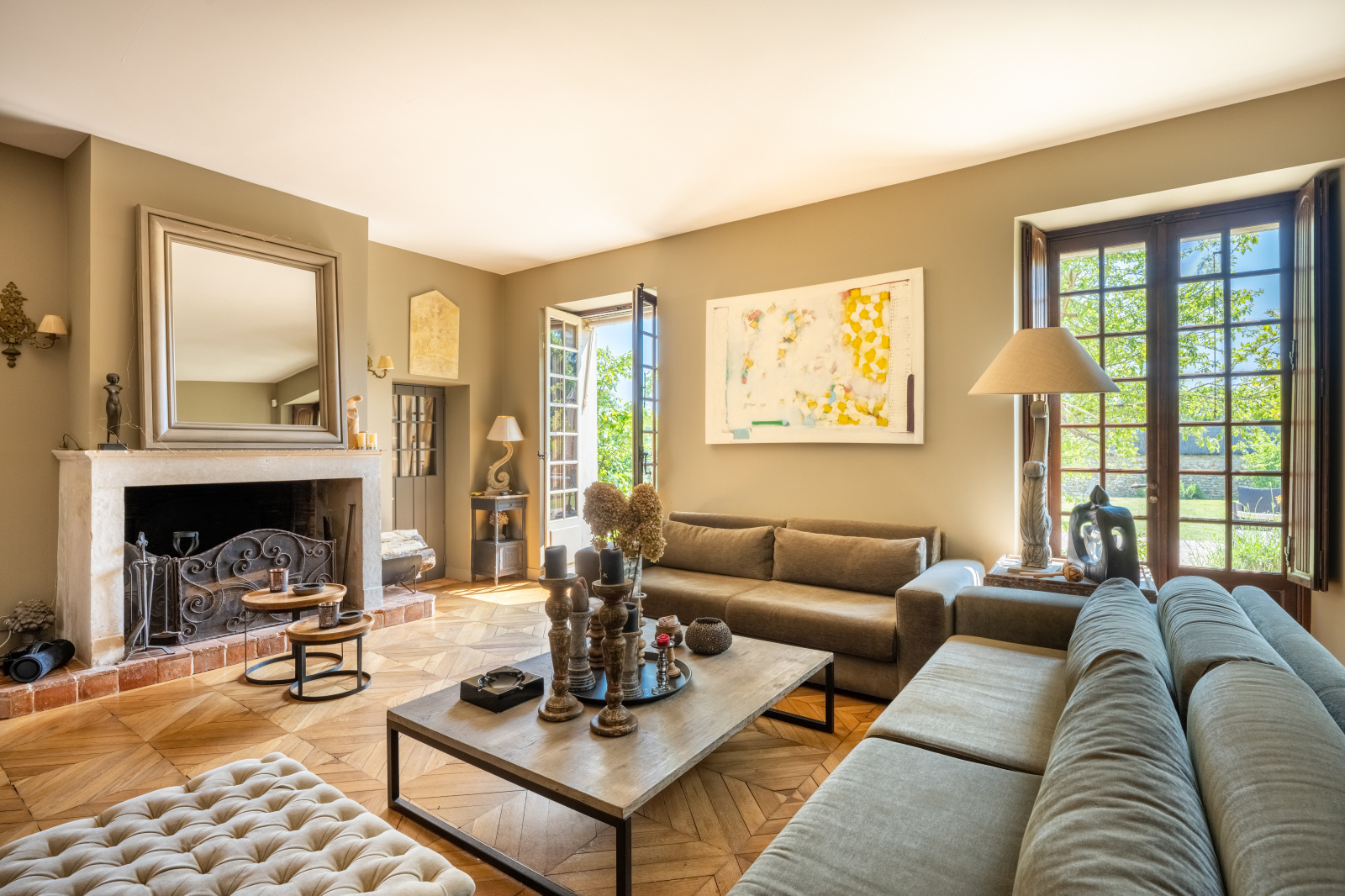 Au rez-de-chaussée du corps principal se trouve un vaste salon de 60 m² avec cheminée, une élégante salle à manger de 47 m² et un bureau. Toutes les pièces ouvrent par de hautes portes-fenêtres donnant sur une grande terrasse et un jardin arboré.