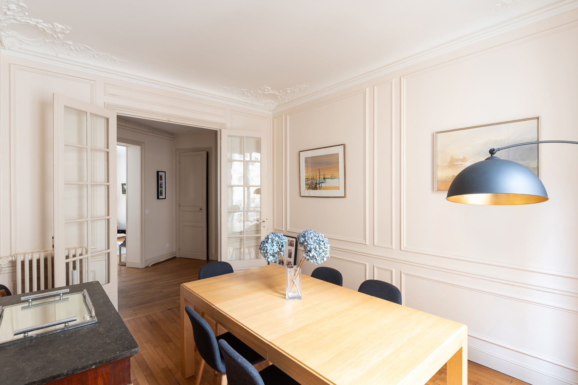 Cet appartement au calme absolu sur cour se compose d’un vestibule d'entrée, d’un salon, d'une salle à manger, de deux chambres sur cour, d’une cuisine indépendante, d’une salle de bains, et de toilettes séparées.